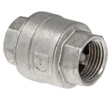 Пружинный обратный клапан с золотниковым механизмом (шток, верхняя, нижняя тарелки) из нейлона (стеклонаполненный полиамид), отличающегося механической, термической, химической стойкостью. Материал пружины – нержавеющая сталь AISI 306. Корпус изделия изготовлен способом объемного горячего штампования из высококачественной латуни CW617N (евростандарт EN12165) с нанесением гальванопокрытия (никелирование). Диапазон рабочих температур: –20… +90 °С. Номинальное давление – 25–40 бар (зависит от типоразмера). Резьба присоединения – внутренняя. Направление потока указано стрелкой на корпусе. Данный обратный клапан монтируется в любом положении, трущиеся поверхности отсутствуют.