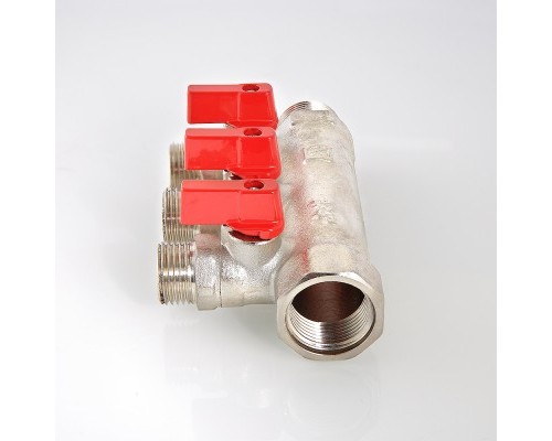 (VTc.580.N) Никелированный коллектор для воды и других сред, неагрессивных к материалам изделия. Корпус изготовлен из качественной сантехнической латуни марки CW617N (европейский стандарт ЕN 12165). Имеет выходы диаметром ½" с наружной резьбой. На каждом выходе предусмотрен отсекающий шаровой кран с минимальным ресурсом 4 тыс. циклов. Диаметр коллектора – ¾ или 1", резьба – внутренняя/наружная. Неремонтопригодный. Рабочая температура – до 110 °С, давление – до 10 бар.