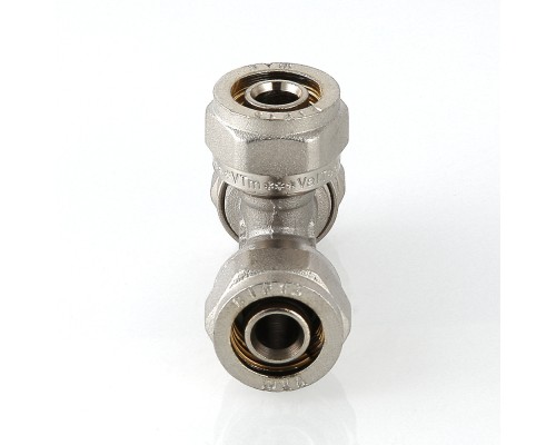 (VTm.331.N) Фитинг обжимной – тройник латунный никелированный для соединения металлопластиковых (металлополимерных) труб. Имеются равнопроходные и переходные модели.