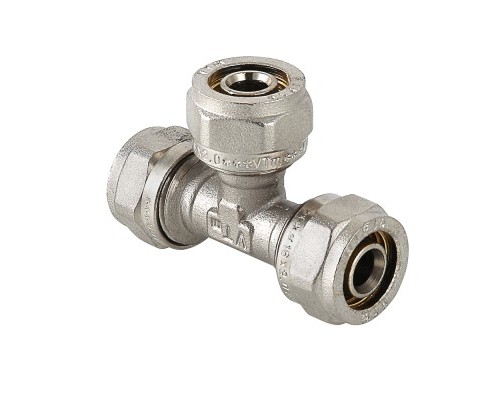 (VTm.331.N) Фитинг обжимной – тройник латунный никелированный для соединения металлопластиковых (металлополимерных) труб. Имеются равнопроходные и переходные модели.