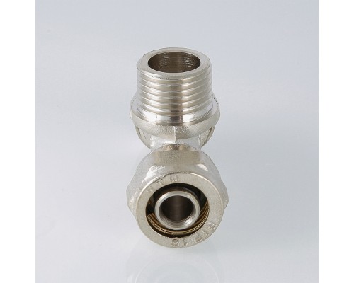(VTm.333.N) Фитинг обжимной – тройник с переходом на наружную резьбу для присоединения металлополимерных (металлопластиковых) трубопроводов. Резьба фитинга – наружная трубная по ГОСТу 6357.