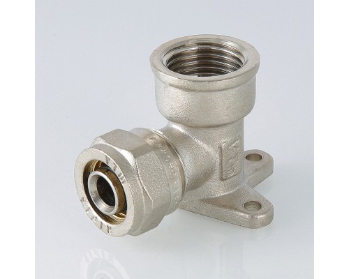 (VTm.354.N) Обжимной фитинг – угольник с креплением и переходом на внутреннюю резьбу для металлопластиковых (металлополимерных) трубопроводов. Резьба фитинга – внутренняя трубная по ГОСТу 6357.