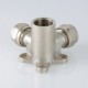 (VTm.334.N) Латунный никелированный угловой тройник с креплением (проходная водорозетка) для соединения металлопластиковой трубы с компонентом системы, имеющим резьбовое подключение. Резьба фитинга – внутренняя трубная по ГОСТу 6357.