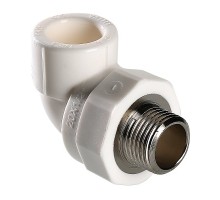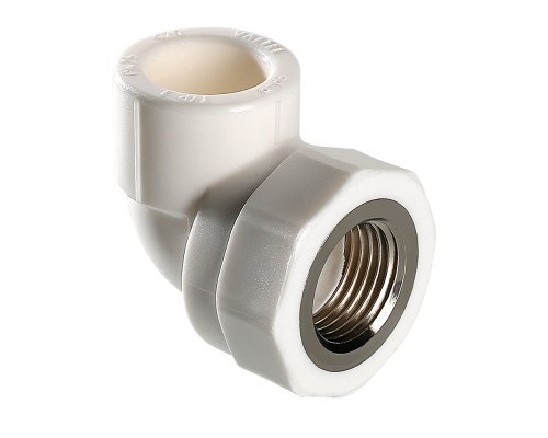 Двухсторонний комбинированный фитинг (полипропиленовый фитинг) для соединения под углом 90° друг к другу полипропиленового трубопровода и компонента инженерной системы с резьбовым подключением. Резьба фитинга – внутренняя трубная по ГОСТу 6357. Предусмотрен участок корпуса шестигранной формы, под гаечный или трубный рычажный ключ.