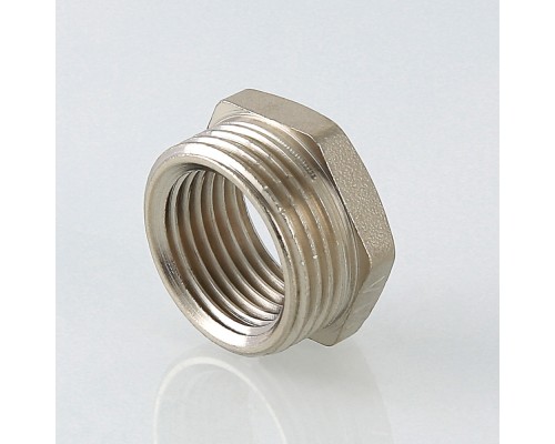 Футорка – фитинг, обеспечивающий соединение труб разного типоразмера, подключение трубопровода к элементу системы с большим диаметром присоединительного патрубка, ремонт (замену) поврежденной резьбы. Изделие выполнено из латуни марки CW617N, никелировано. Резьба – наружная/внутренняя, по типу – трубная цилиндрическая, совместимая с наружной конической (ГОСТ 6211). Шестигранная головка футорки служит ее вкручиванию гаечным ключом. Максимальное рабочее давление использования соединителя зависит от температуры среды: 250 °С – 2,7/1,7 бар, 200 – 3,0/2,7, 120 – 40/25 (до/более 1”).