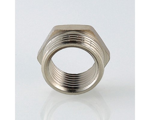 Футорка – фитинг, обеспечивающий соединение труб разного типоразмера, подключение трубопровода к элементу системы с большим диаметром присоединительного патрубка, ремонт (замену) поврежденной резьбы. Изделие выполнено из латуни марки CW617N, никелировано. Резьба – наружная/внутренняя, по типу – трубная цилиндрическая, совместимая с наружной конической (ГОСТ 6211). Шестигранная головка футорки служит ее вкручиванию гаечным ключом. Максимальное рабочее давление использования соединителя зависит от температуры среды: 250 °С – 2,7/1,7 бар, 200 – 3,0/2,7, 120 – 40/25 (до/более 1”).