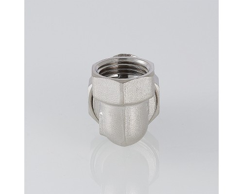 Разъемный угловой сгон, соединение компонентов которого осуществляется накидной гайкой (угловая американка). Материал фитинга – сантехническая латунь CW617N. Детали никелированы. Конструкция соединителя содержит уплотнительное кольцо из эластомера EPDM. Рабочая температура ограничена для изделия 120 °C. Номинальное давление моделей диаметром до 1” включительно составляет 40, свыше – 25 бар. Резьба фитинга – внутренняя/наружная, оснащенная насечками для наилучшего удержания герметика. Максимальное усилие накручивания гайки – 30 H•м. Область использования углового сгона – трубопроводы из стали, меди, латуни, пластиковые, металлопластиковые.