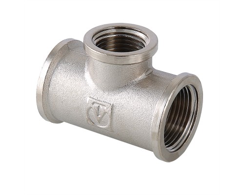 Латунный никелированный трехсторонний фитинг с переходом на меньший диаметр в центральном выходе. Резьба – внутренняя, цилиндрическая трубная по ГОСТу 6357 (ISO 228, EN 10226), совместима также с наружной конической трубной резьбой по ГОСТу 6211 (ISO R7).