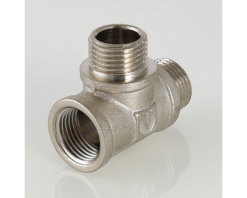 Латунный никелированный трехсторонний фитинг, равнопроходной. Резьба – внутренняя/наружная/наружная, цилиндрическая трубная по ГОСТу 6357 (ISO 228, EN 10226). Внутренняя резьба совместима также с наружной конической трубной резьбой по ГОСТу 6211 (ISO R7).