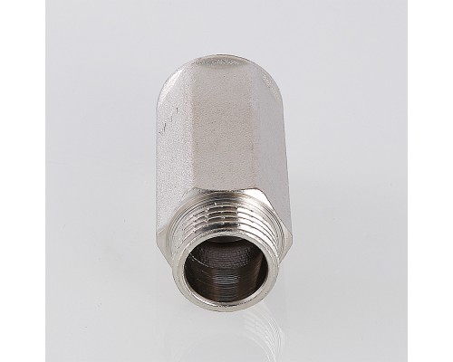 Латунный никелированный фитинг для удлинения соединений на 10–50 мм (в зависимости от модели). Форма корпуса – шестигранная, под гаечный ключ. Резьба – внутренняя/наружная, цилиндрическая трубная по ГОСТу 6357 (ISO 228, EN 10226), совместимая также с наружной конической трубной резьбой по ГОСТу 6211 (ISO R7). Диаметр – 1/2".