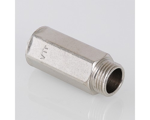 Латунный никелированный фитинг для удлинения соединений на 10–50 мм (в зависимости от модели). Форма корпуса – шестигранная, под гаечный ключ. Резьба – внутренняя/наружная, цилиндрическая трубная по ГОСТу 6357 (ISO 228, EN 10226), совместимая также с наружной конической трубной резьбой по ГОСТу 6211 (ISO R7). Диаметр – 1/2".