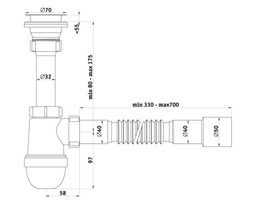 • Сифон сливной АНИ пласт C0115 для кухонных моек с диаметром сливного отверстия 50-60 мм